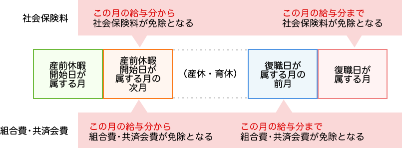 出産休暇および育児休業中は毎月給与より控除している社会保険料(厚生年金保険料、健康保険料)と組合費、共済会費が免除となります。