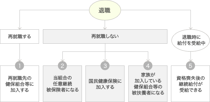 退職と同時に再就職する場合は、再就職先の医療保険に加入しますが、退職後すぐに仕事をしない場合は、次の医療保険制度のいずれかに加入することになります。