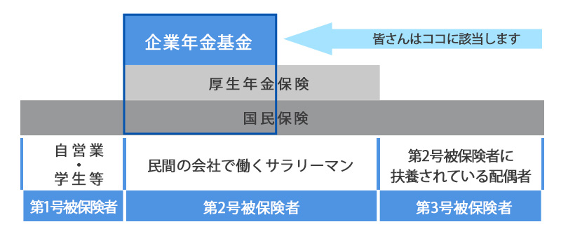 皆さんはそれらに加えて、会社独自の企業年金制度である「中村屋企業年金基金」にも加入します。つまり、公的年金(厚生年金保険、国民年金)と企業年金の3階建ての年金に加入し、将来は国と基金の両方から給付を受けられます。
