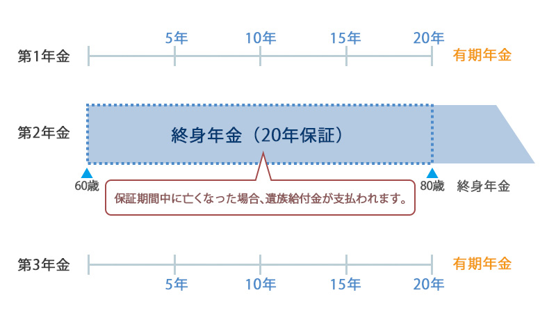 加入者期間が20年以上で60歳に達した方は、老齢給付金を受けることができます。当基金の老齢給付金は、第1年金は5年・10年・15年・20年の有期年金、第2年金は20年保証付終身年金、第3年金は5年・10年・15年・20年の有期年金です。保証期間中に受給権者が亡くなった場合は、ご遺族に残りの保証期間分の年金を遺族給付金(一時金)としてお支払いします。