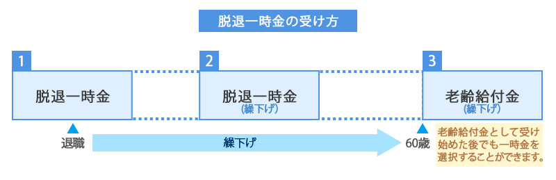加入者期間が20年以上で60歳未満で退職した方が、脱退一時金を繰下げて受ける場合は、60歳から老齢給付金として受けるか、60歳までの間に脱退一時金として受けるかを退職時に選択します。